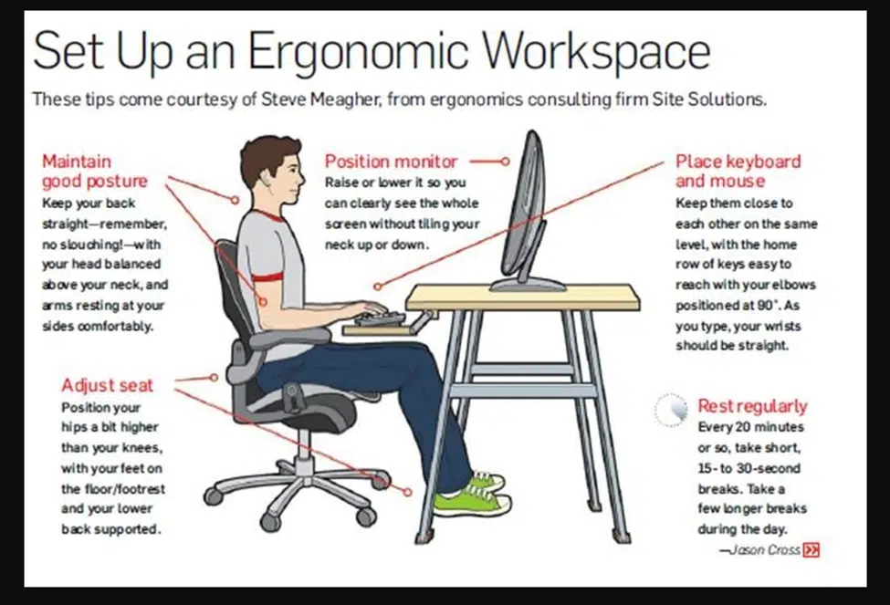 - No slouching! Provide information on how to adjust an ergonomic chair.