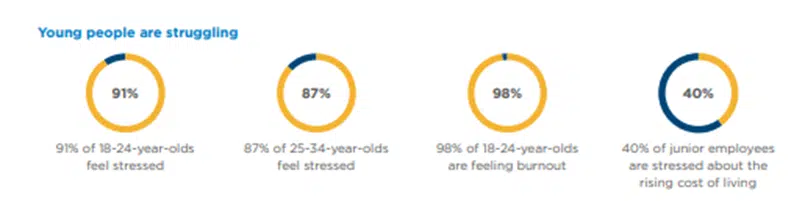 Gen Z and Millennials share common concerns such as workplace stress (75% are willing to leave a job with a toxic culture), mental health and stress management, physical fitness, and sleep quality.