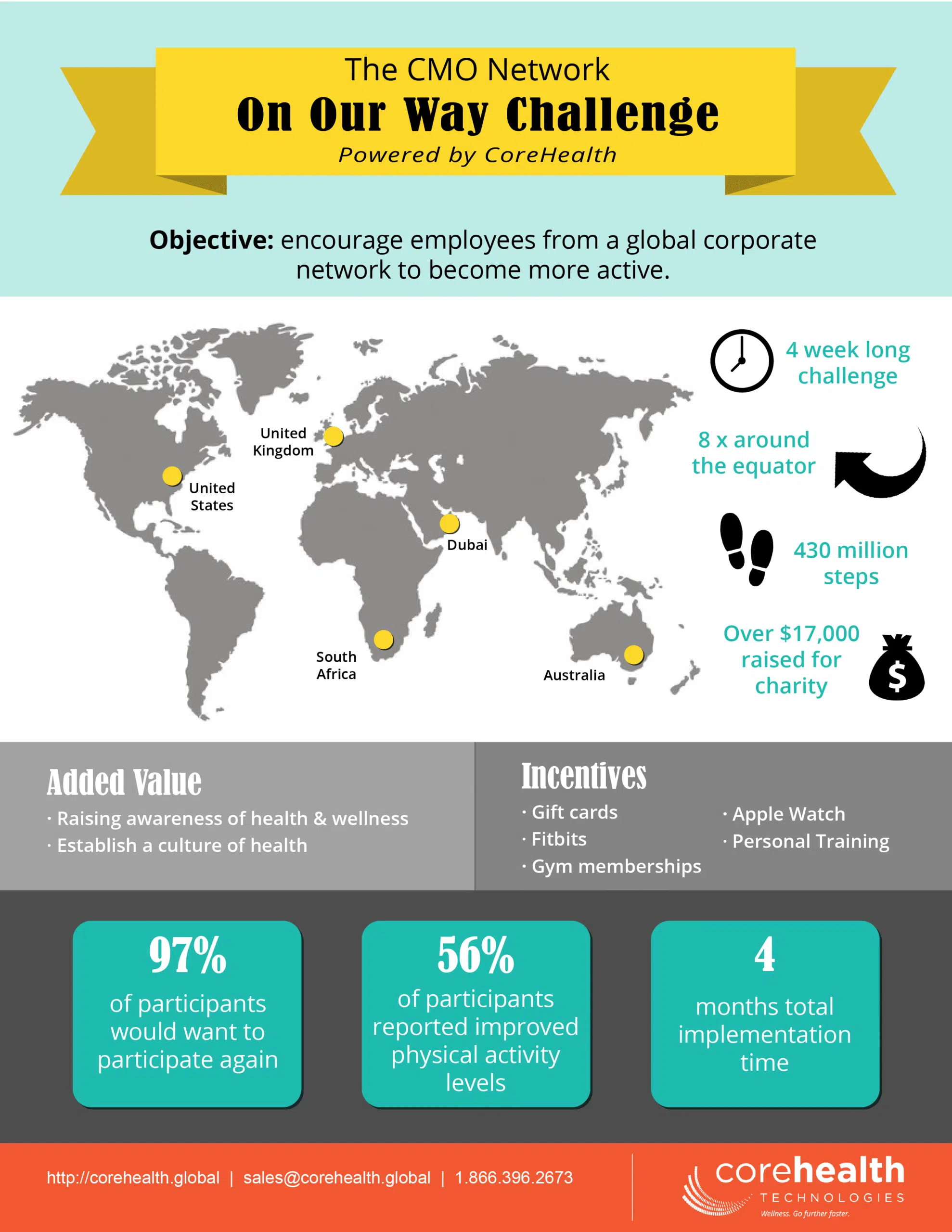 In an effort to help its employees be healthier, more productive, and engaged, a large international company – we’ll call it Company X – started a wellness program that involved each of its 25 locations around the world. Their global insurance business partnered with CoreHealth to power a 4-week wellness activity challenge that engaged 60% of its eligible employees worldwide.