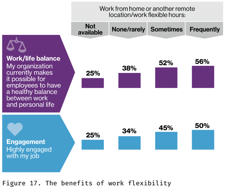 A recent survey report on flexible work arrangements from Willis Towers Watson shows that employees have “significantly more positive views around their work/life balance and greater engagement with their jobs when they can work more flexibly.”